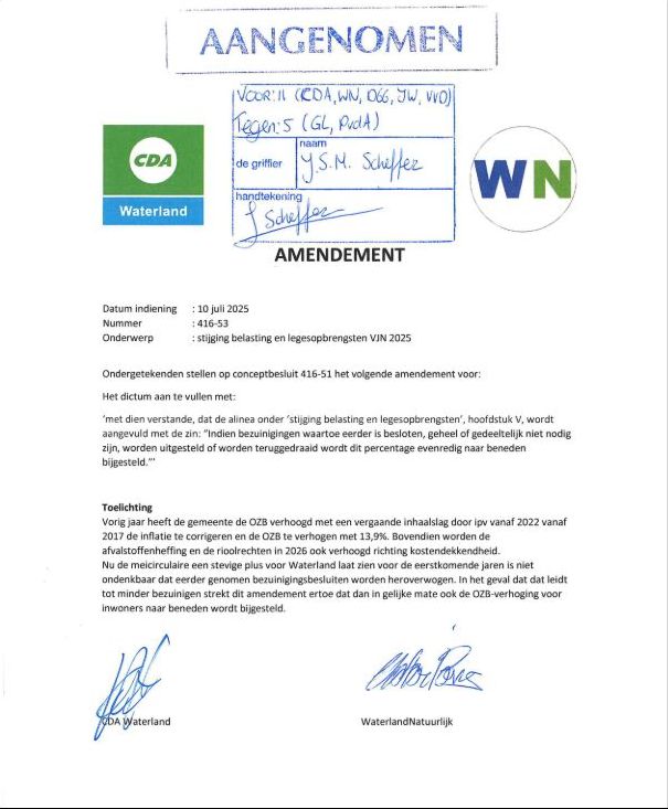 In juli 2025 is er door de raad een verstrekkend amendement aangenomen. De door CDA en WaterlandNatuurlijk ingediende wijziging, zorgt ervoor dat wanneer bezuinigingen worden teruggedraaid, dat belastingen met hetzelfde getal moeten worden verlaagd. Dus als er ergens €100.000- minder wordt bezuinigd, dan moet het college ook ergens anders €100.000,- aan belastingen verlagen. Dit zorgt er voor dat de belastingen weinig zullen stijgen in 2026 want bezuinigen wil men ook liever niet.